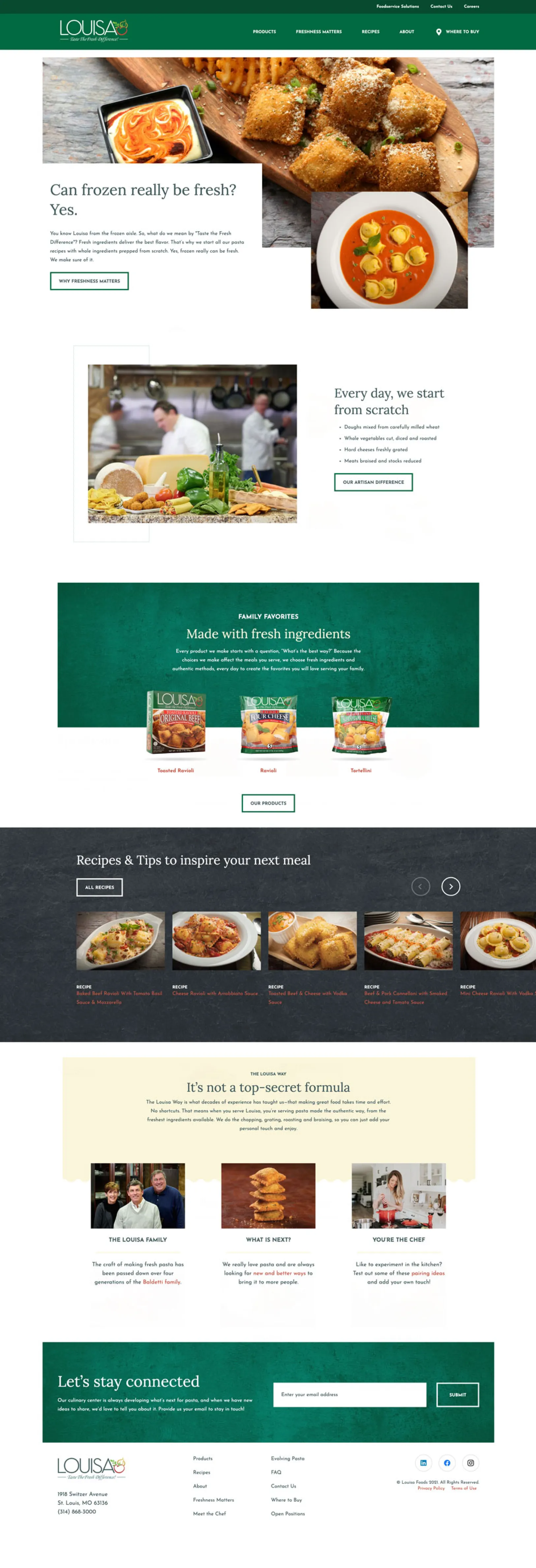 Louisa Foods is a St. Louis based, family-owned business started more than 55 years ago. They prepare fresh-made pastas, appetizers, & sauces. Our goal was to create a website that showcased the diverse set of products they carry, how to get them, and inspire others to create dishes that nonna would be proud of.