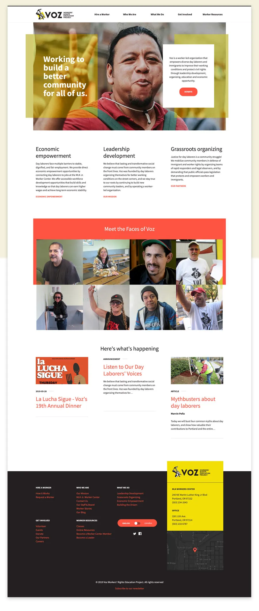 Turn Agency conducted a workshop with Voz that helped uncover the needs within the organization. With their new website, Voz can tell the mission of the organization as well as the rich history behind it. The faces of Voz is a concept that allows the user to learn the stories of day laborers and Voz staff. The blog and events section help keep the community in touch with what is going on at Voz and the easy-to-use worker request form allows companies to legally hire day labor help quickly online.